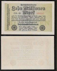 10 Million mark banknote of Germany, issued by the Reichsbank in 1923. These notes are from the post World War I period (the Weimer Republic) in Germany - when the country faced hyperinflation. The hyperinflation was caused by the debt that Germany had taken on to finance the War, and was triggered by a Franco-Belgian occupation of the industrial district of Ruhr - to force Germany to pay a war indemnity. When prices rise by over 50% in a month, it is considered a case of hyperinflation. At its worst phase, prices of goods in Germany would change daily - sometimes the prices of food in a restaurant would change while the patrons were dining! The German hyperinflation and the consequent economic suffering was one of the factors that led to the rise of Hitler.