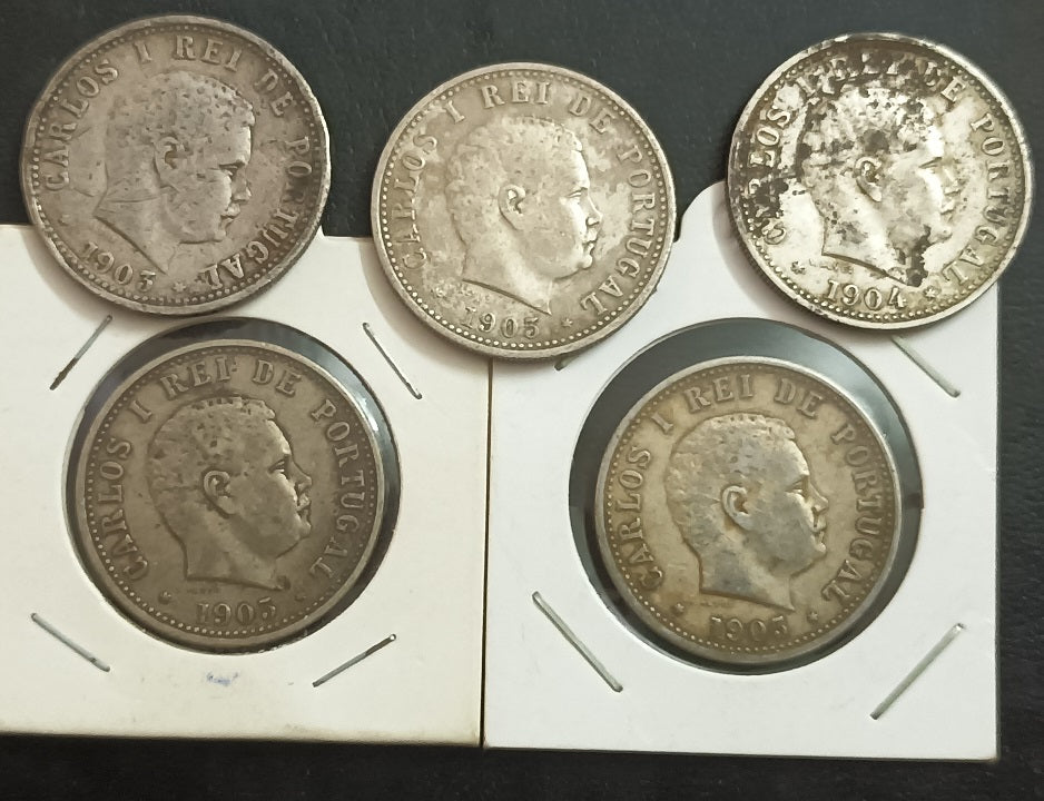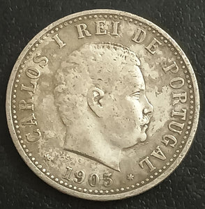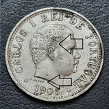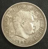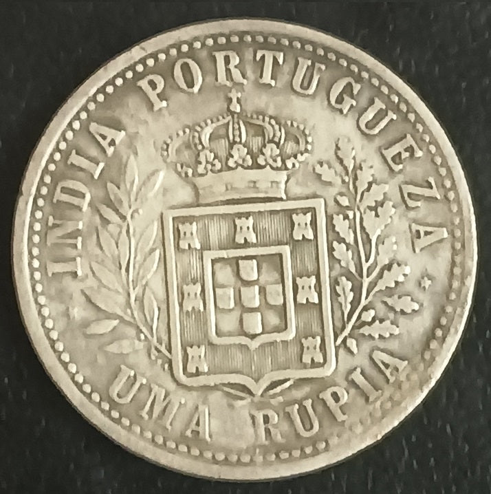 Silver Uma Rupia (One Rupee) coin of Portuguese India, minted in the name of Carlos I. These coins were identical to the British Indian rupee in weight (11.66 grams), purity (0.917) and size. These coins were minted from 1903-04, and are less common compared to British Indian coins, because of the smaller size of the Portuguese empire in India. Read more about this coin here