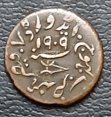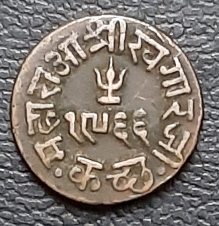 Copper 1 Trambiyo (1/48 kori) coin of the Princely State of Kutch, issued during the reign of Khengarji III. These coins are issued jointly in the name of Khengarji and Edward VII, the British ruler. The writing on one side is in Devnagari script with the date in Vikram Samvat, while the script on the other side is in Urdu with the date as per the English calendar. These coins were minted from 1908-1910 AD. The trishul (trident), one of the symbols of Kutch, can be seen on one side, while a katar (dagger) is inscribed on the other side.