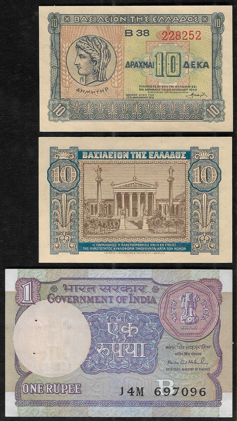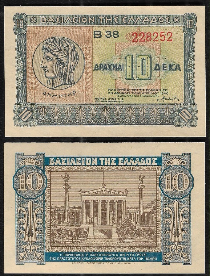 10 Drachma banknote of Kingdom of Greece, printed in 1940. The obverse has the denomination to the right, and the portrait of Demeter, the Greek Goddess of harvest, to the left. The reverse features a view of the University of Athens. The Kingdom of Greece was established in 1832 - after Greece gained independence from the Ottoman Empire, and lasted till 1973, with a break from 1924-1935 - when a Republic was proclaimed. During World War II, Greece was under occupation of Axis powers (1941-44).