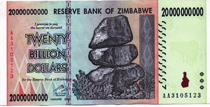 20 billion dollars note from Zimbabwe, from 2008 - when country suffered one of the worst episodes of hyperinflation in the 21st century.